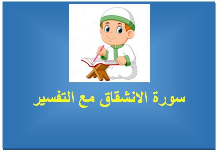 إِذَا السَّمَاءُ انْشَقَّتْ (1) وَأَذِنَتْ لِرَبِّهَا وَحُقَّتْ (2) وَإِذَا الْأَرْضُ مُدَّتْ (3) وَأَلْقَتْ مَا فِيهَا وَتَخَلَّتْ (4) وَأَذِنَتْ لِرَبِّهَا وَحُقَّتْ (5) يَا أَيُّهَا الْإِنْسَانُ إِنَّكَ كَادِحٌ إِلَى رَبِّكَ كَدْحًا فَمُلَاقِيهِ (6) فَأَمَّا مَنْ أُوتِيَ كِتَابَهُ بِيَمِينِهِ (7) فَسَوْفَ يُحَاسَبُ حِسَابًا يَسِيرًا (8) وَيَنْقَلِبُ إِلَى أَهْلِهِ مَسْرُورًا (9) وَأَمَّا مَنْ أُوتِيَ كِتَابَهُ وَرَاءَ ظَهْرِهِ (10) فَسَوْفَ يَدْعُو ثُبُورًا (11) وَيَصْلَى سَعِيرًا (12) إِنَّهُ كَانَ فِي أَهْلِهِ مَسْرُورًا (13) إِنَّهُ ظَنَّ أَنْ لَنْ يَحُورَ (14) بَلَى إِنَّ رَبَّهُ كَانَ بِهِ بَصِيرًا (15) فَلَا أُقْسِمُ بِالشَّفَقِ (16) وَاللَّيْلِ وَمَا وَسَقَ (17) وَالْقَمَرِ إِذَا اتَّسَقَ (18) لَتَرْكَبُنَّ طَبَقًا عَنْ طَبَقٍ (19) فَمَا لَهُمْ لَا يُؤْمِنُونَ (20) وَإِذَا قُرِئَ عَلَيْهِمُ الْقُرْآنُ لَا يَسْجُدُونَ (21) بَلِ الَّذِينَ كَفَرُوا يُكَذِّبُونَ (22) وَاللَّهُ أَعْلَمُ بِمَا يُوعُونَ (23) فَبَشِّرْهُمْ بِعَذَابٍ أَلِيمٍ (24) إِلَّا الَّذِينَ آمَنُوا وَعَمِلُوا الصَّالِحَاتِ لَهُمْ أَجْرٌ غَيْرُ مَمْنُونٍ (25)