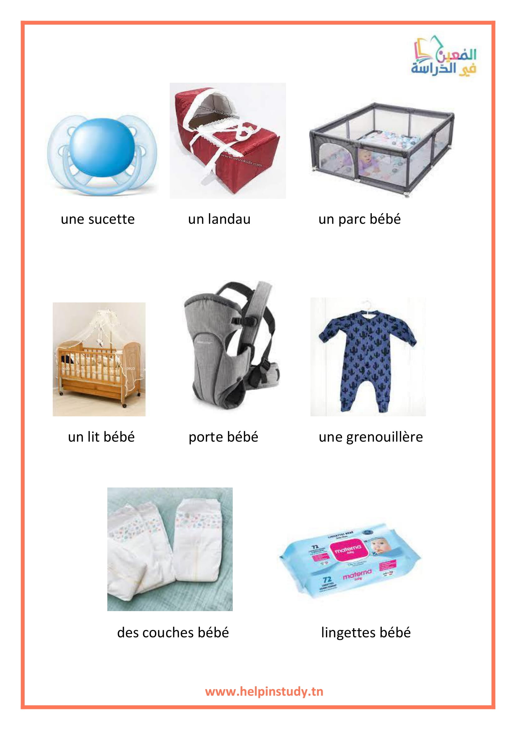 الرئيسية2022أكتوبر24Le trousseau du bébé 4ème année Le trousseau du bébé 4ème année / السنة الرابعة, دروس و ملخصات 4 / بواسطة faten Ben Ammar Le trousseau du bébé 4ème année Une poussette un bavoir un biberon le bonnet la brassière une paire de chaussettes le nid d’ange une salopette une sucette un landau un parc bébé un lit bébé porte bébé une grenouillèredes couches bébé lingettes bébé Le-trousseau-du-bebeتنزيل
