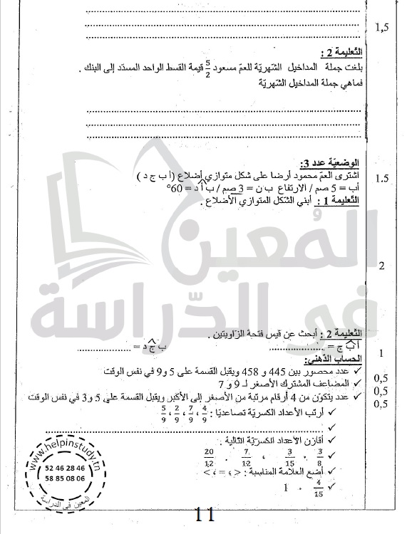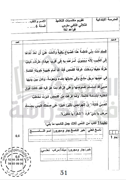 امتحانات المعين في الدراسة في جميع المواد لتلاميذ السنة السادسة من التعليم الأساسي مرفقة بالإصلاح